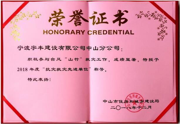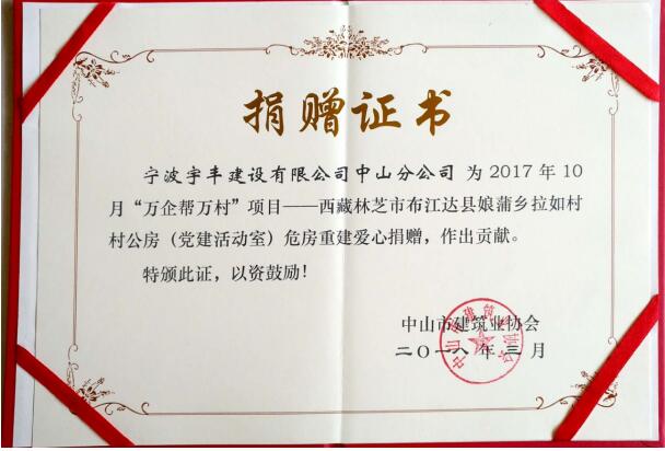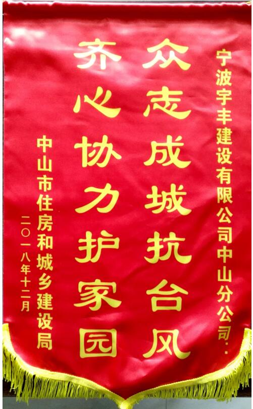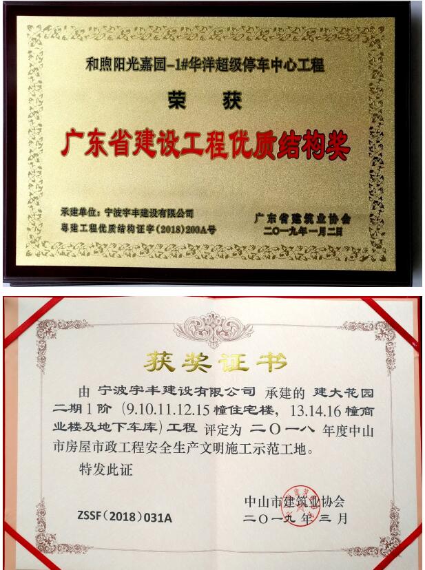 我司承建的和煦阳光嘉园-1#华洋超级停车中心工程荣获“广东省建设工程优质结构奖”;建大花园二期1阶(9.10.11.12.15幢住宅楼,13.14.16幢商业楼及地下车库工程荣获“中山市房屋市政工程安全生产文明施工示范工地”殊荣;被授予“万企帮万村”项目——西藏林芝市布江达县娘蒲乡拉如村村公房(党建活动室)危房重建爱心捐赠证书;被授予“抗灾救灾先进单位”称号;被授予“众志成城抗台风、齐心协力护家园”锦旗。